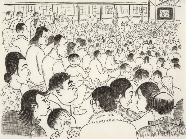 Movie Night At the Grandstand, Tanforan Assembly Center, San Bruno, California, 1942, By Miné Okubo